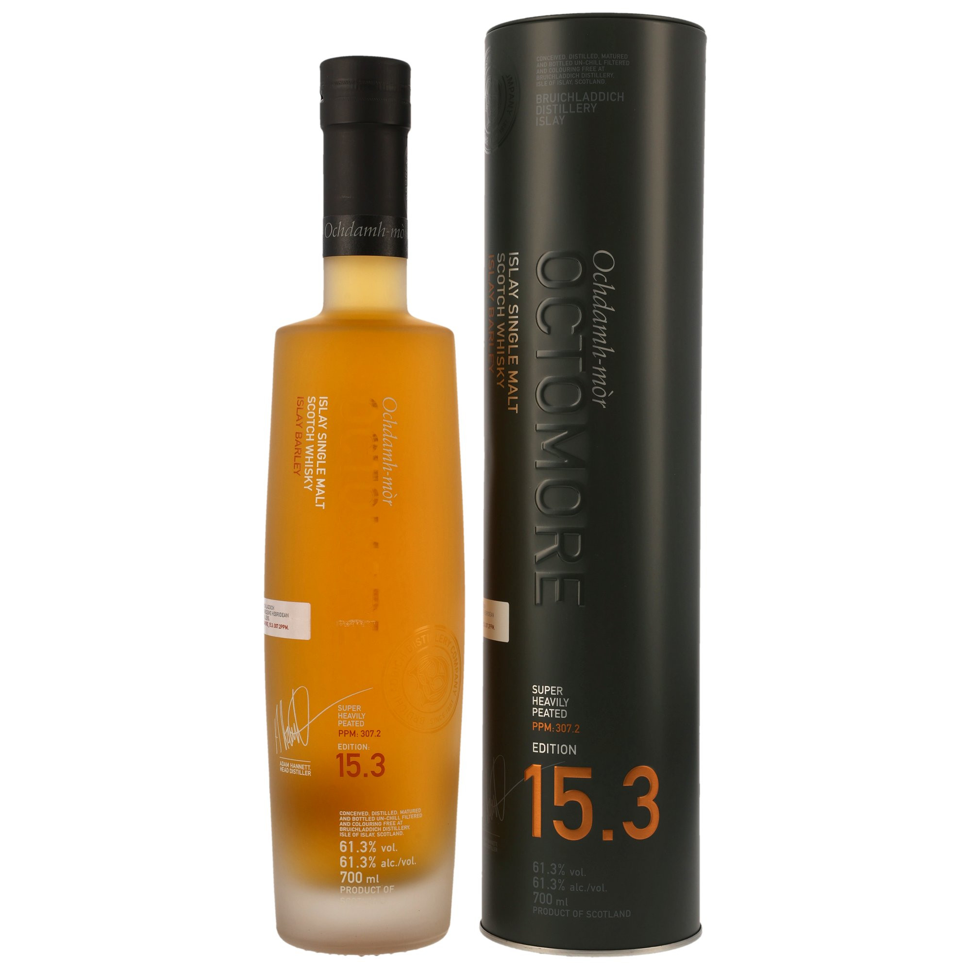 Mit 307,2 PPM ist der Octomore 15.3 komplex, robust und voller Charakter. Der beeindruckende Rauch wird durch reife Früchte aus der langsamen Destillation ausgeglichen. Geprägt von der salzigen Gischt des Meeres, verleiht die heimische Gerste von Islay nicht nur malzige Süße, sondern weckt auch ein echtes Gefühl der Herkunft.