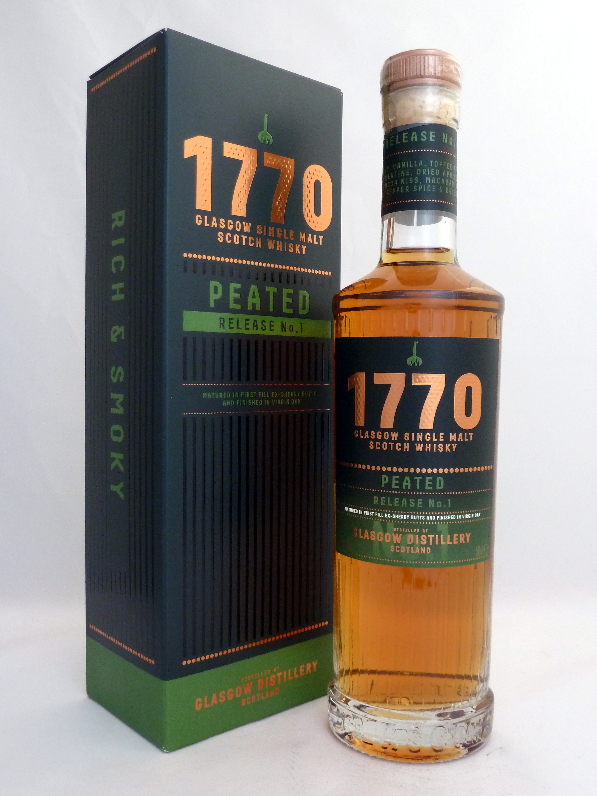 Dieser mit 50 ppm getorfte Lowland-Malt stammt aus der 2014 gegründeten Glasgow Distillery. Er reifte in First Fill Ex-Sherryfässer und erhielt ein Finish in frischen Weißeichenfässern. Der Single Malt schmeckt würzig mit Orange, süßem Rauch und weichen Toffee-Noten. Dann erdig mit dunklen Früchten.